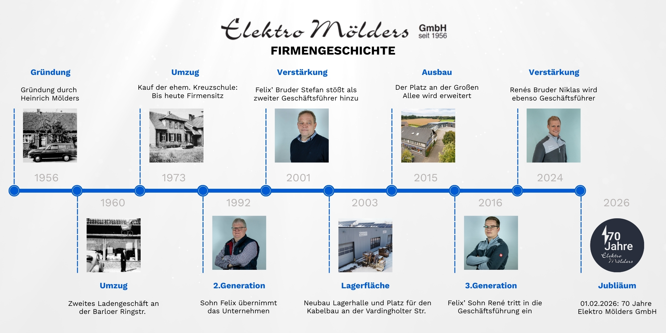 Alles begann ganz klein im Jahre 1956: Elektromeister Heinrich Mölders gründete unser Unternehmen in einer kleinen Werkstatt, die bereits drei Jahre später zu klein wurde und in größere Räumlichkeiten umziehen musste. 1973 zog unser Unternehmen an die Große Allee 2, bis heute immer noch Firmensitz, der immer wieder konsequent ausgebaut wurde, zuletzt im Jahre 2015. Im Jahr 1992 übernahm Felix Mölders, Sohn des Firmengründers, das Unternehmen. Im Jahr 2001 stieß sein Bruder Stefan Mölders als zweiter Geschäftsführer dazu. Seit 2016 unterstützt auch Felix‘ Sohn René Mölders die beiden in der Geschäftsführung. Im Jahr 2024 kam auch Felix‘ jüngster Sohn Niklas Mölders in die Geschäftsführung und leitet den Bereich Rohrleitungs- und Kabelbau.